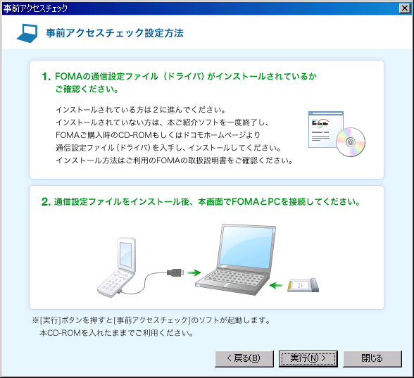 ドコモショップからもらってきた「定額データプランスターとキット CD-ROM ( 2008.5 )」を入れて事前アクセスチェックを起動。