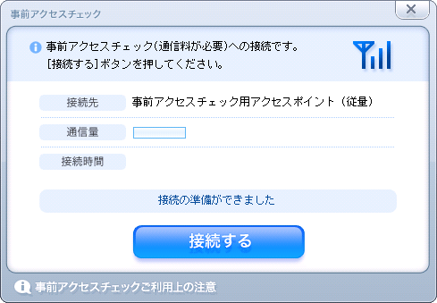 使用許諾契約の確認が済むと事前アクセスチェックの接続画面が表示されます。