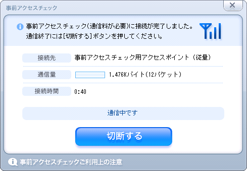 事前アクセスチェックとは、定額データプランでの接続を手元にある FOMA 携帯電話で確認できるツールだそうで、チェックを行った分の通信料は別途かかります。