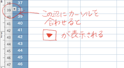 行の先頭にある数字部分にカーソルを移動すると下向き三角アイコンが表示されます。