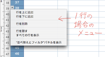 その下向き三角アイコンをクリックするとメニューが表示されるので、「行を隠す」をクリックで現在の 1 行を隠すことができます。