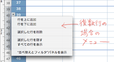 複数行を一気に隠したい場合は、複数行を選択した状態で行の先頭にある数字部分にカーソルを移動、下向き三角アイコンが表示されるので「選択した行を隠す」をクリックすると選択したすべての行を隠すことができます。