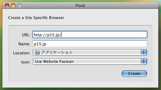 基本的な使い方はアプリケーションフォルダの Fluid.app を起動して、開きたい URL と専用アプリの名前を指定するだけです。