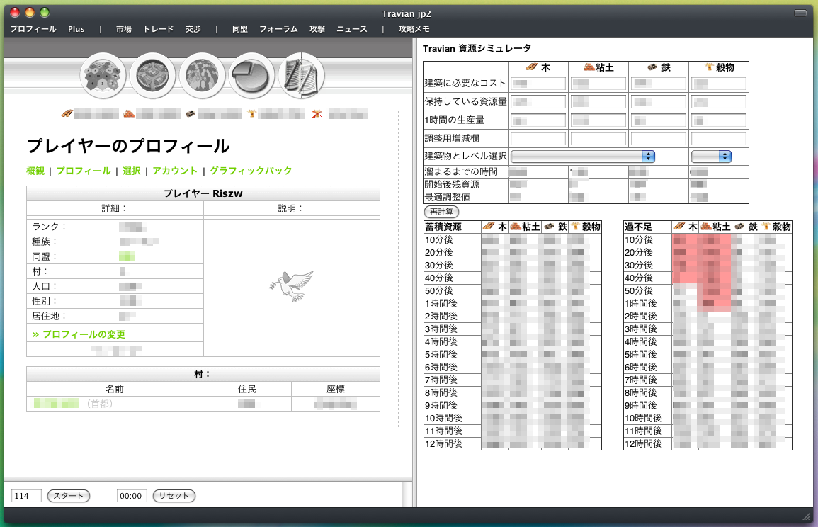 クエスト中にもらった Plus アカウントが切れてから何時間後にレベルを上げられるかわからなくなって不便だったので、メインのゲーム画面 + Travian 資源シミュレータを表示しています。